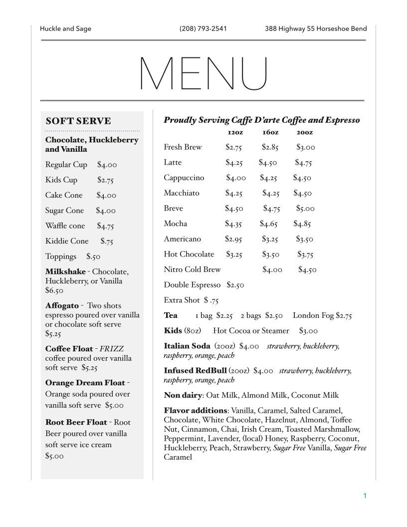 Welcome to Huckle and Sage, a charming cafe nestled in Horseshoe Bend, Idaho. This delightful spot is perfect for lunch, offering a selection of scrumptious sandwiches such as the Pesto Chicken Sandwich and Grilled Ham And Cheese, all priced around $9.50. Guests rave about the Huckleberry ice cream, a standout favorite among patrons.